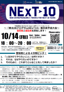 EO North Japanでは「東北 Innovation Base プログラム」の一環として全世界から東北にゆかりのある起業家、起業準備中の方を対象に「NExT10(ネクスト10) powered by EO North Japan」と題したピッチ大会を東北各県で開催します。