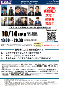 10/14(金)開催ショートプレゼン大会「東北IBプログラムNExT10」岩手県予選大会について、登壇者が決定しましたので、お知らせします。